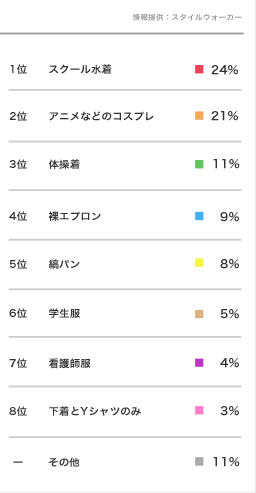 続いて、第5位「縞パン」(8%)、第6位「学生服」(5%)、第7位「看護師服」(4%)、第8位「下着とYシャツのみ」(3%)、いう結果になりました。後半になるにつれ、女子も楽しめるちょっとしたコスプレというラインナップになりました。
