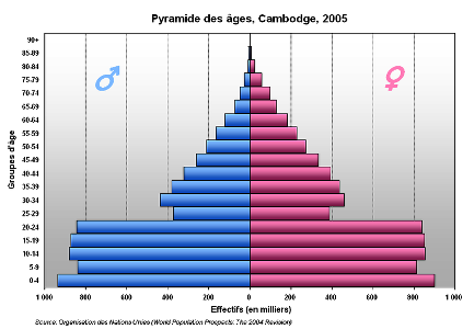 下のグラフは、カンボジア共産党(クメール・ルージュ)政権終了から26年経った2005年度のカンボジアノ人口ピラミッドです。