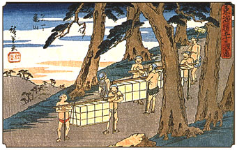 東海道を、天秤棒で担いで歩いて運んだ山葉寅楠と河合喜三郎。