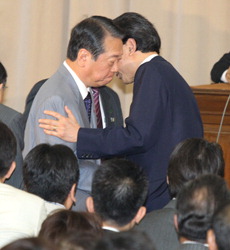 鳩山総理は両院議員総会会場で小沢元幹事長と握手をして菅直人副総理とも笑みを浮かべて握手し、辞任の挨拶を始めた。