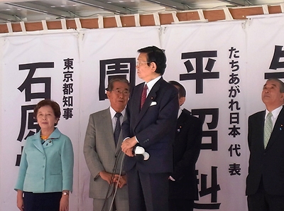 新宿駅西口ロータリーでは、先陣をきって「たちあがれ日本」の街頭演説会が行われました。
