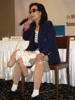 義足をはずし、北朝鮮での体験を話す脱北者の女性。北朝鮮の収容所で受けた拷問などのでせいで両足を失った。この女性は2005年、豆満江を渡って中国に行き、タイを経由して韓国に来た(水沼啓子撮影)