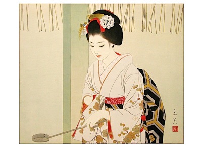 女性は左手に柄杓を持ち、ちょっと伏し目に描かれています。