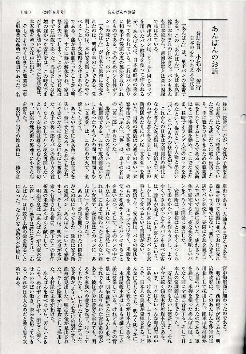 掲載された「あんぱん」のお話は、あんぱんが、西洋風のパンでなくて、実は純日本風のパンとして工夫を凝らされたものであること、そして明治のはじめに陸軍の軍用食となることで、いっきに全国に広がったことについて書いた短文です。