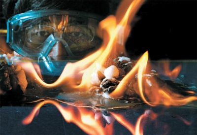 パク博士が2009年に東海の水深2000メートルの海底から採取したガスハイドレートに火をつけている。写真で白い氷のように見えるのがハイドレートで、残りの部分は泥だ。