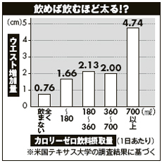 「カロリーゼロのダイエット飲料を飲んでいなかった人のウエストは、9年半で平均0.76cm増加しました。一方、1日に0.5本(6オンス=約180ml)飲み続けた人はその約2倍、1日1~2本(約180~360ml)の人は約3倍ウエストサイズが増え、2本以上飲んできた人は約6倍の4.74cmも増えたのです」