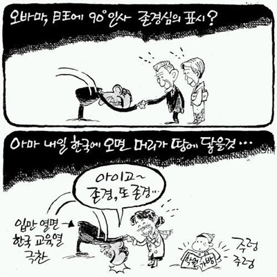「日本における丁寧な挨拶が『お辞儀』であり、オバマ大統領はこれを尊重したものであるから、韓国大統領訪問時においても『当然に』『韓国式の丁寧な挨拶』が行われるであろう」などと報じられていたことです。