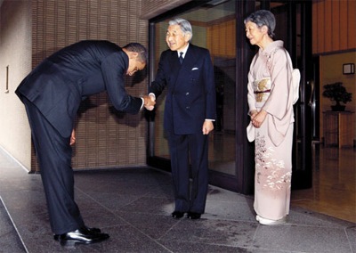 上の写真は、2009年11月14日の、米国オバマ大統領の天皇、皇后両陛下謁見の際の挨拶のときの写真です。