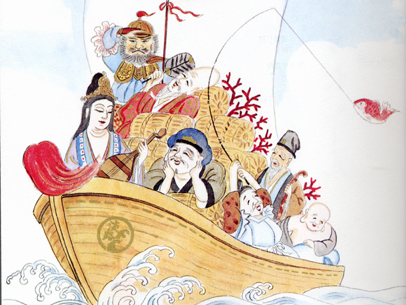またよく見かける七福神は、冒頭の絵にあるように、みなさん宝船に乗っておいでです。