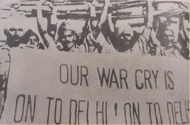 ボースは「チャロ・デリー」 つまり「デリーへ!」と、 進撃を宣言し、人々はその メッセージを掲げて行進 しました。
