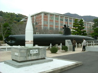海軍兵学校跡と真珠湾特殊潜航艇、手前は大和主砲弾