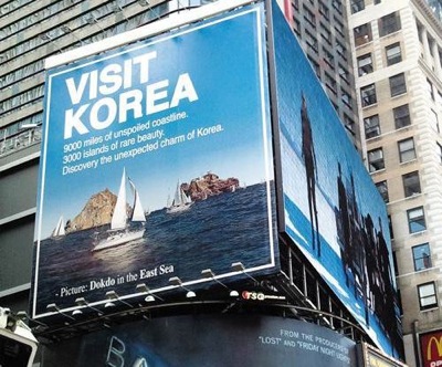 上の写真は、ニューヨークのタイムズ・スクエアに掲げられた大きな看板で、「東海にある独島へ来てください」と書かれています。