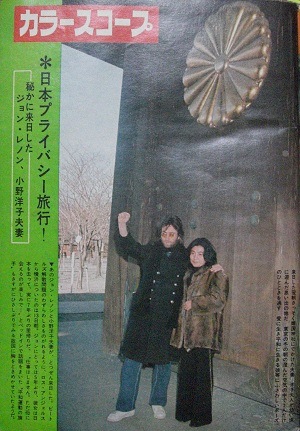 下の写真は、ジョン・レノンがオノ・ヨーコさんと一緒に、靖国神社を参拝したときのものです。