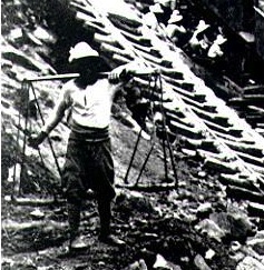 上の写真は、箱根の山に、当時の姿のまま残っている東海道です。ご覧いただいてわかる通り、道幅は一間(1.8メートル)くらいしかありません。東海道は、江戸時代最大の大街道です。いまでいったら国道一号線、または東名高速道路です。にもかかわらず、道幅が、あまりに狭いと思いませんか? なぜ狭いかというと、道幅を広くする必要がなかったからです。道幅を広くするのは、牛車や、馬車など、物流用の車が通るからです。ところが江戸時代、牛車や、馬車などの車は、市中の近距離輸送には使われましたが、市や県をまたがる長距離輸送には、牛も馬もあまり用いられていません。