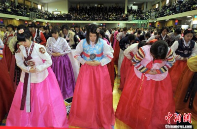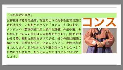 ですから女性がチマ・チョゴリを着ているときなどは、この腹痛ポーズでないと、スカート(チマ)が胸から下に広がっていますから、お辞儀をしたときにスカート(チマ)が、前に垂れ下がることになり、これはなるほどみっともない姿です。