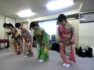 正しい日本式の立礼は、女性の場合、足を揃えて立ち、手先はまっすぐ伸ばしてそろえ、自然に手が定まる位置を出発点として、静かに腿の上を膝がしらに向けて滑らせてお辞儀をする。