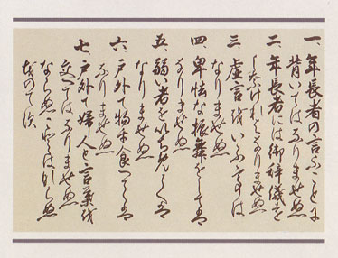 一、年長者(としうえのひと)の言ふことに背いてはなりませぬ