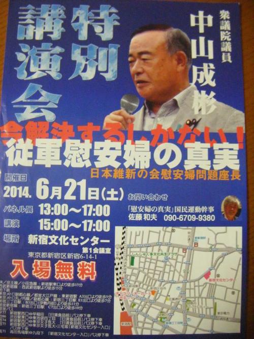 日頃、「慰安婦の真実国民運動」の幹事としてご活躍の佐藤和夫先生のご主催によって、来る6月21日に、東京・新宿で中山成彬先生による特別講演会が開催されます。