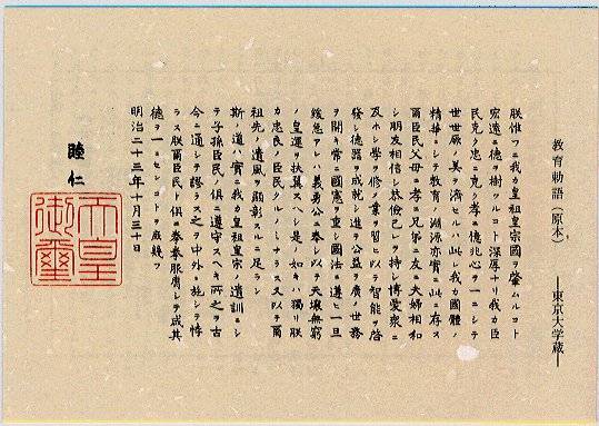 我カ臣民克ク忠ニ克ク孝ニ億兆心ヲ一ニシテ世世厥ノ美ヲ濟セルハ此レ我カ國體ノ精華ニシテ教育ノ淵源亦實ニ此ニ存ス
