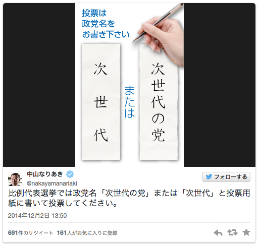 「小選挙区は自民に、比例は次世代に」を合言葉に応援しています。