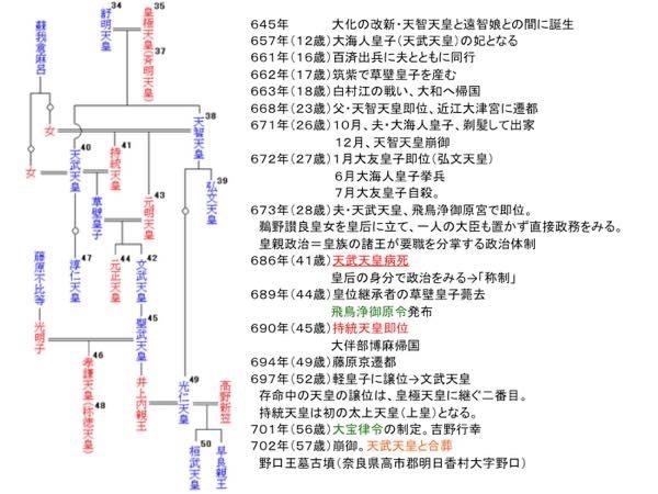 持統天皇は、天智天皇の第ニ皇女で、母は蘇我氏の出の遠智娘(おちのいらつめ)した。