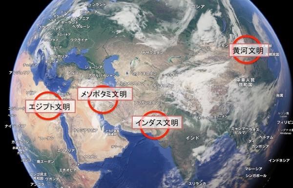 そこに、いわゆる世界四大文明の地を赤で丸印をつけてみました。