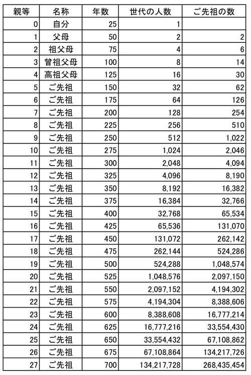 御覧頂いてわかりますように、27代さかのぼると、ご先祖の数は1億3千万人を越えます。