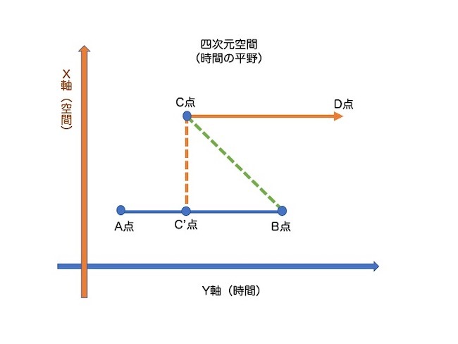 では、D点まで進んだとき、C'からBまでの時間はどうなるのかというと、そのまま存在し続けます。