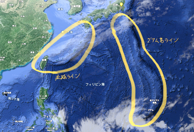 ただ、違いは、グアム島ラインが小さな島がポツポツ並んでいるのに対し、琉球ラインは列島を形成していて陸が大きいことです。