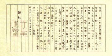 我カ臣民克ク忠ニ克ク孝ニ億兆心ヲ一ニシテ世世厥ノ美ヲ濟セルハ此レ我カ國體ノ精華ニシテ教育ノ淵源亦實ニ此ニ存ス