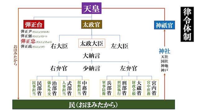 その「おほみたから」が豊かに安全に安心して暮らせるように、天皇直下に太政官、神祇官、弾正台を置くという体制です。